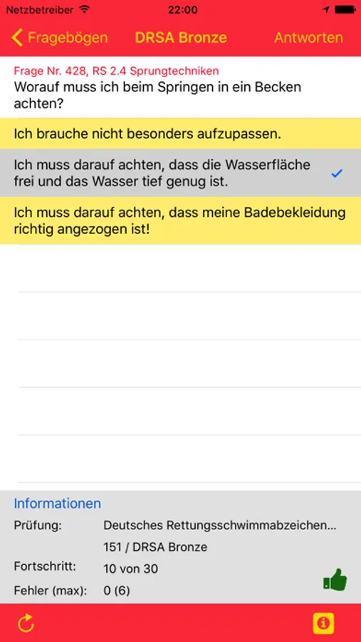 Ein weiteres Highlight der App sind die Fragebögen (Quiz) für Schwimm- und Rettungsschwimmabzeichen, Bootsführerscheine und Sprechfunk