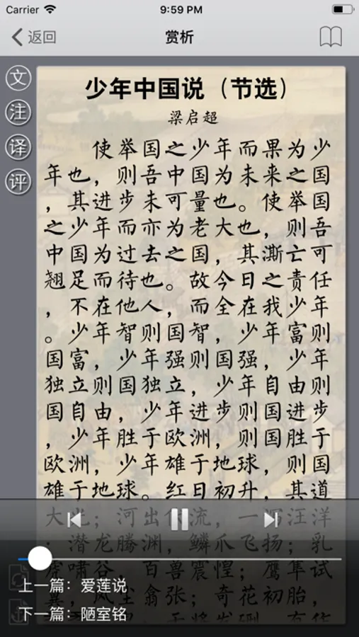 三、内容全面,朗诵声情并茂:本软件的每一篇文学作品都有配乐朗诵、作品(或作者)简介、原文、注解、译文、名句、评析等七大内容,可使您在大饱耳福的同时,增加对古典文学作品的理解。同时,一篇篇精到的评析文字,对古典文学作品的作者和作品、内容与形式、价值和意义、色彩与意境、构思与手法、语言与修辞等均作了极为深入、透彻的剖析,多角度、多层次地揭示了古典文学作品的丰厚内涵。这不仅能帮助用户掌握作品的来龙去脉,品味意象、语言的精美,使用户受到熏陶与感染,而且还会大大开拓视野,培养探究能力,增强文化底蕴。