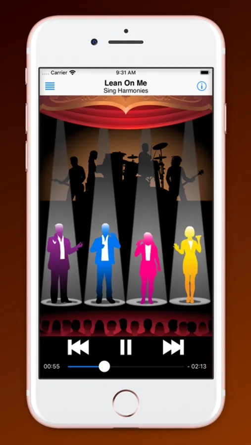 • Tap ‘play’ to hear a 4-part harmony version of the song. Tap any singer to rotate through the three volume settings: full, soft, and silent. Tap the band in the background to turn the music track on or off.