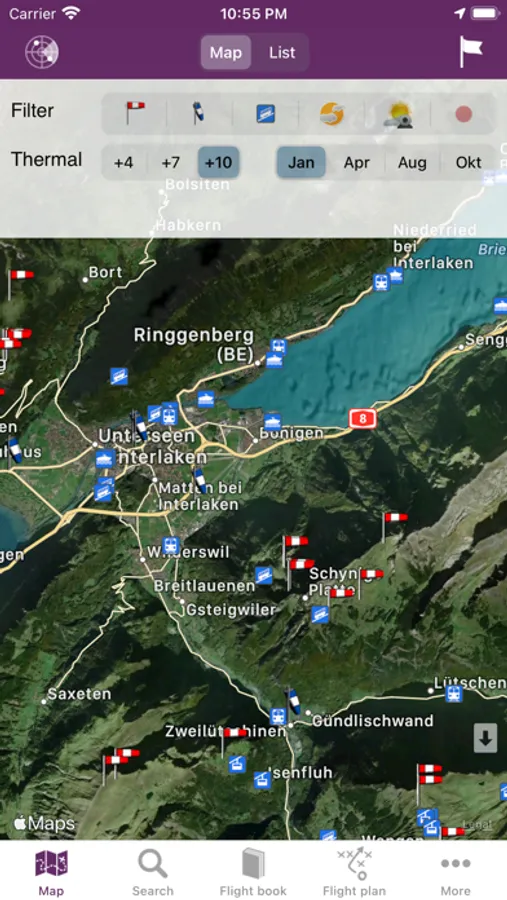 • The places can be clearly displayed on different maps. In addition to the Apple satellite, hybrid and standard map, OpenTopoMap and OpenStreetMap are also integrated in where2fly. For Switzerland, the Swisstopo national map is also supported.