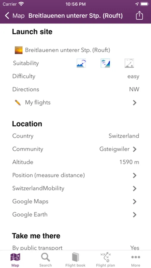 • Furthermore, where2fly stores more than 28'000 public transport stations in Switzerland. You can easily plan your journey to the to the take-off site or the journey home from your landing site. In addition, some navigation apps are linked to find the take-off site by car or on foot. The connection of a timetable app enables the timetable information to the take-off or landing site (for all alpine countries).