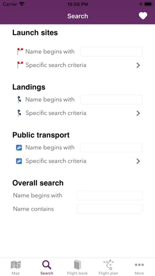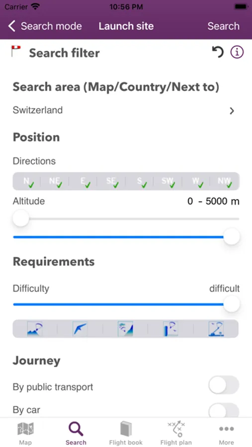 • All places are visually displayed on an interactive map. It is also possible to search according to different criteria. searched for. For example: where is there a take-off site in the Bernese Oberland to fly in westerly winds above 2000 m, which can be reached by public transport?