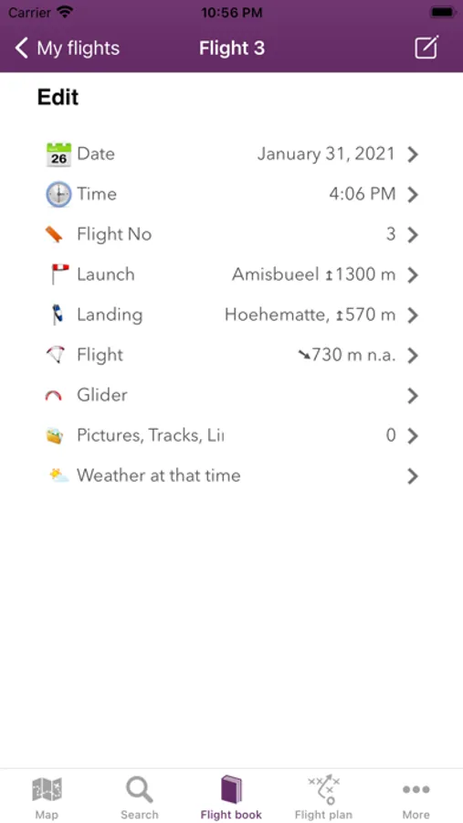 • • The "Flightlog Module" gives you the possibility to record all your flights directly in where2fly. Choose comfortably one of the available or landing sites, or define your personal location directly on the map. You can enter countless attributes, such as Flight duration, flight type, wind conditions, weather, your impressions of the flight, and a comment. All flights are stored in the local database so you can call up statistics directly. Import all your flights directly from XContest. All data is automatically recognised and assigned. You can also easily analyse the track on the map at any time. All data can be exported and imported via Excel interface.