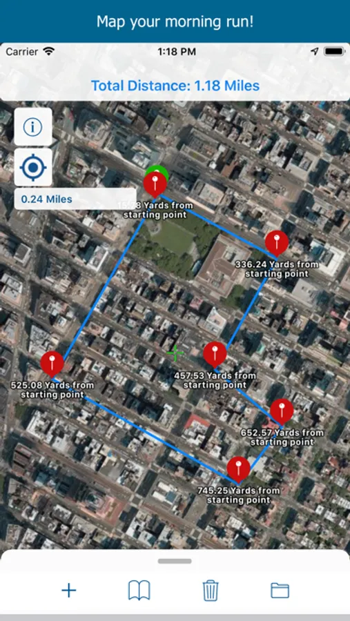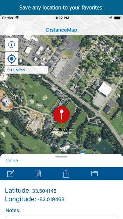 Or add a marker to the map and save that location for later! Simply move the map to your target and tap the toolbar button to add a marker. That's it! Distance will be calculated from where you are standing and update as you move! You can then save that location for later use!