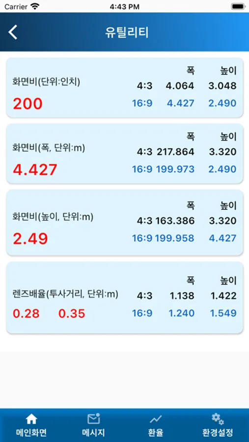별도로 스크린 크기에 따른 화면이나 렌즈의 비율을 계산해주는 유틸리티 기능도 내장하고 있습니다.