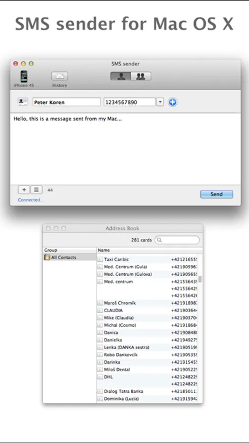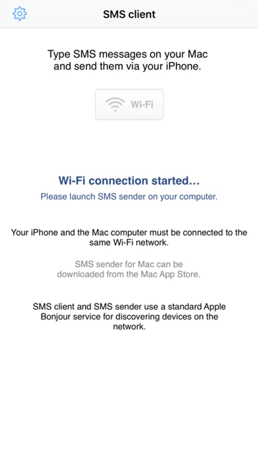 This iPhone client application requires Mac version of SMS sender, which can be downloaded from the App Store. Your iPhone and the Mac computer must be on the same network.
