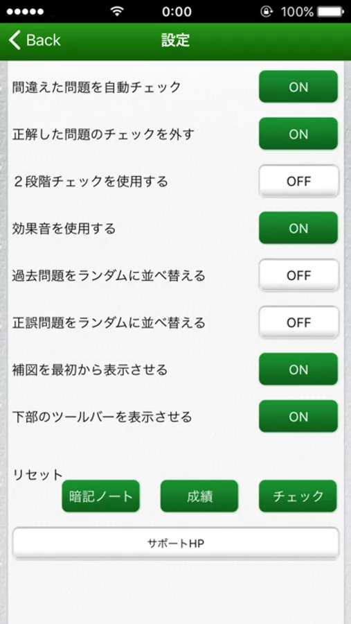 (自動チェック、ランダム、補図のON・OFF、成績リセット等)