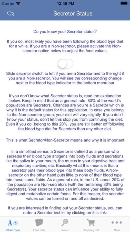 This is the only official Blood Type Diet® app released by Dr. Peter D’Adamo, international best selling author of the Eat Right For Your Type® book. Whether you are new to the Blood Type Diet® or a long time supporter, this app provides the food lists that are Right for Your Type® at your fingertips. It’s convenient when shopping, traveling, dining out, or simply when you are at home and don’t want to check the Eat Right For Your Type® book. The Blood Type Diet® app lists the Beneficial, Neutral, and Avoid foods for all four blood types. It now includes Unknown for those foods not determined.