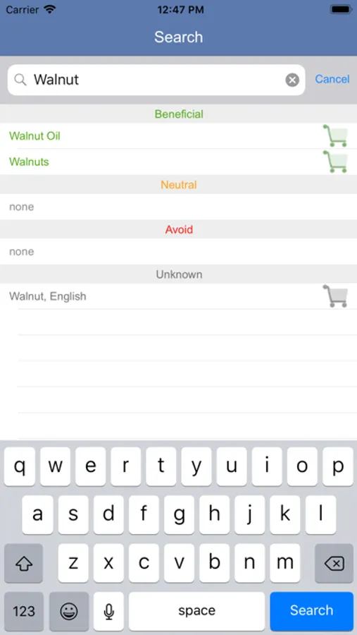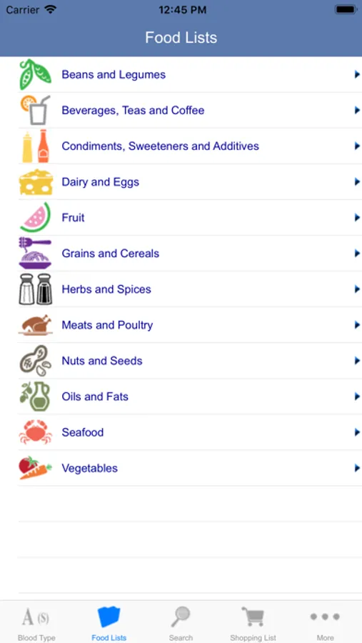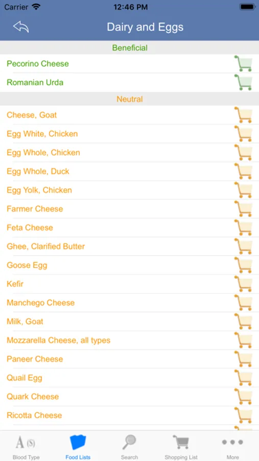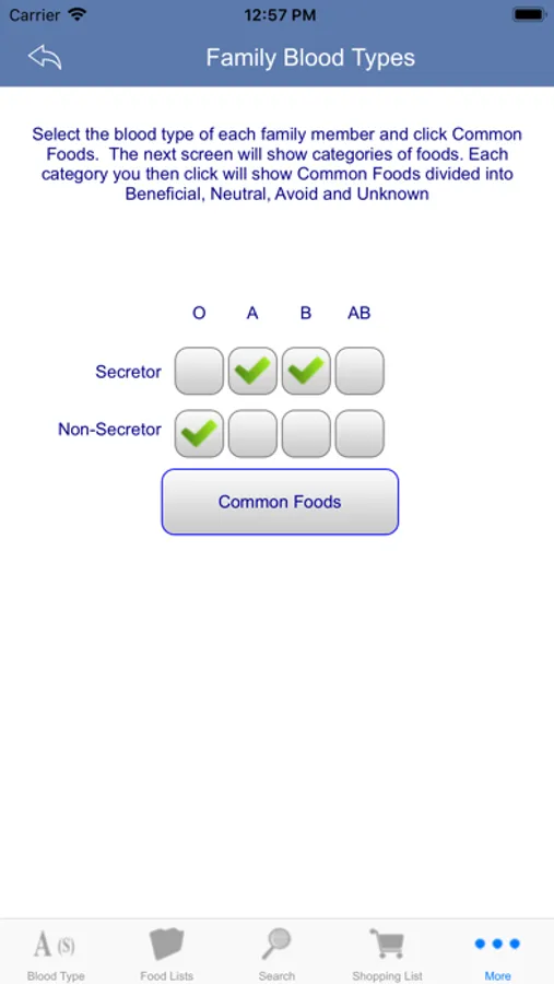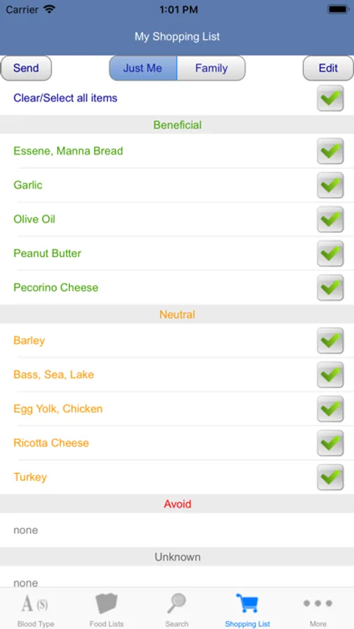 Shopping List - choose your own or combine family list for multiple blood types —see More section, then Family Food