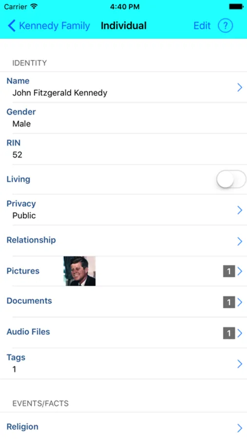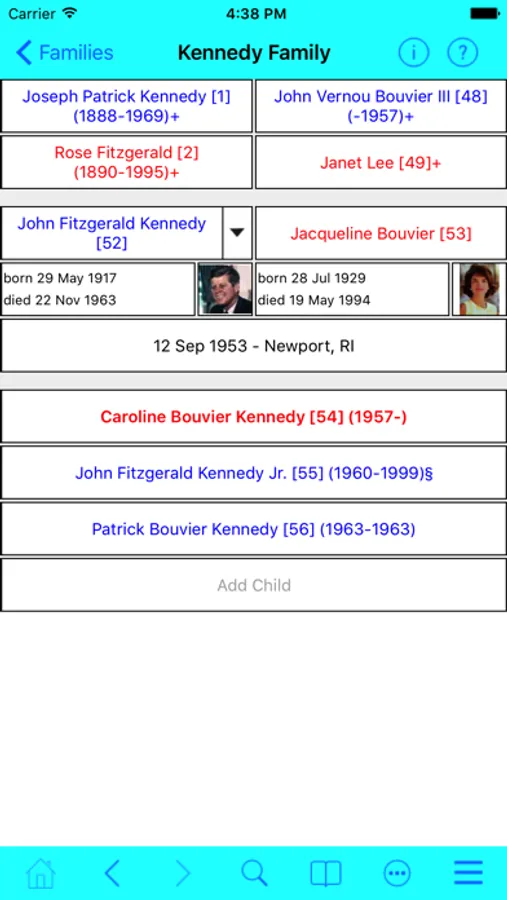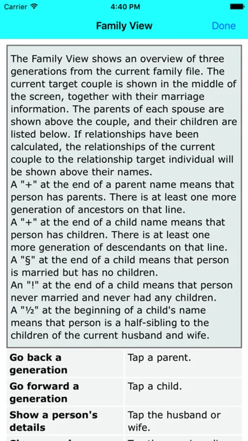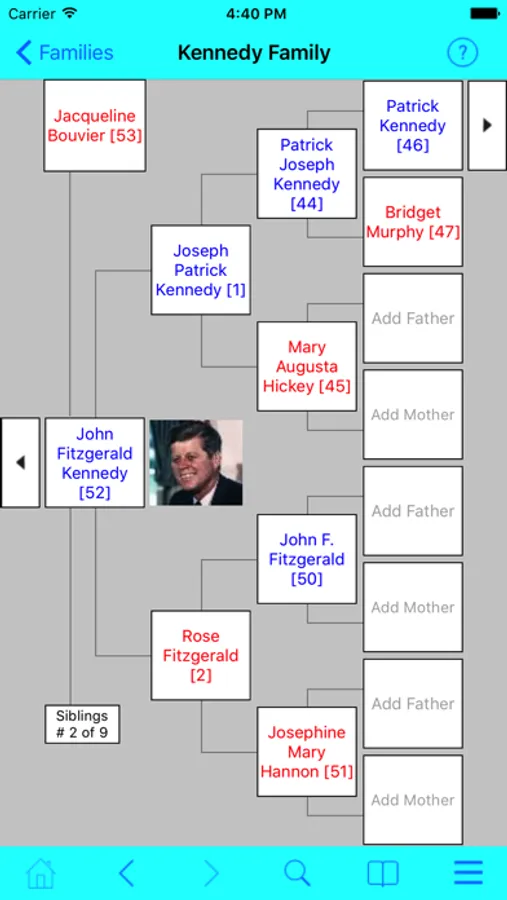 Families is designed to operate in conjunction with Legacy Family Tree, the leading Windows-based genealogy software from Millennia Corp. Your Legacy family files can be easily transferred to your iPhone, iPod Touch, or iPad, enabling them to be viewed and edited wherever you are. Families supports the following functionality: