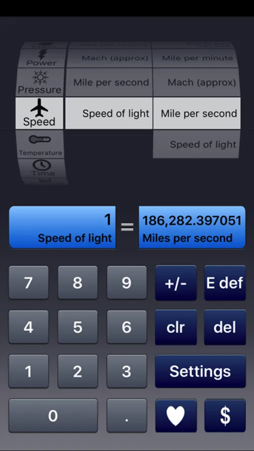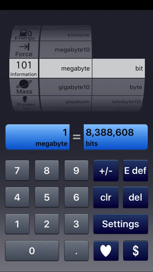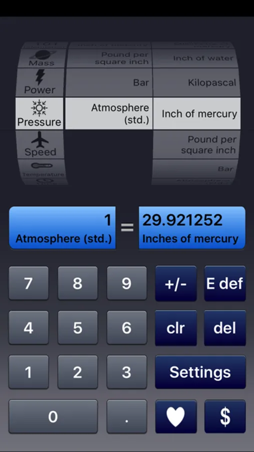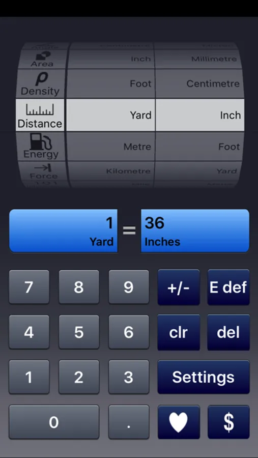 Units currently included are acceleration, angle, area, density, distance, energy, force (or weight), mass, power, pressure, speed, temperature, time, and volume.