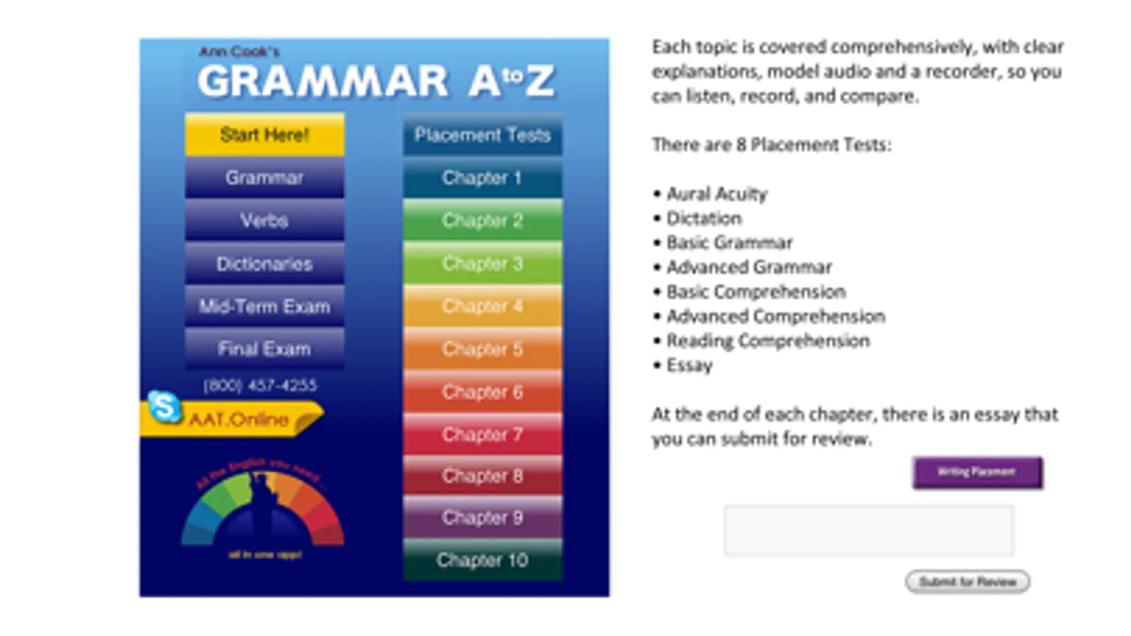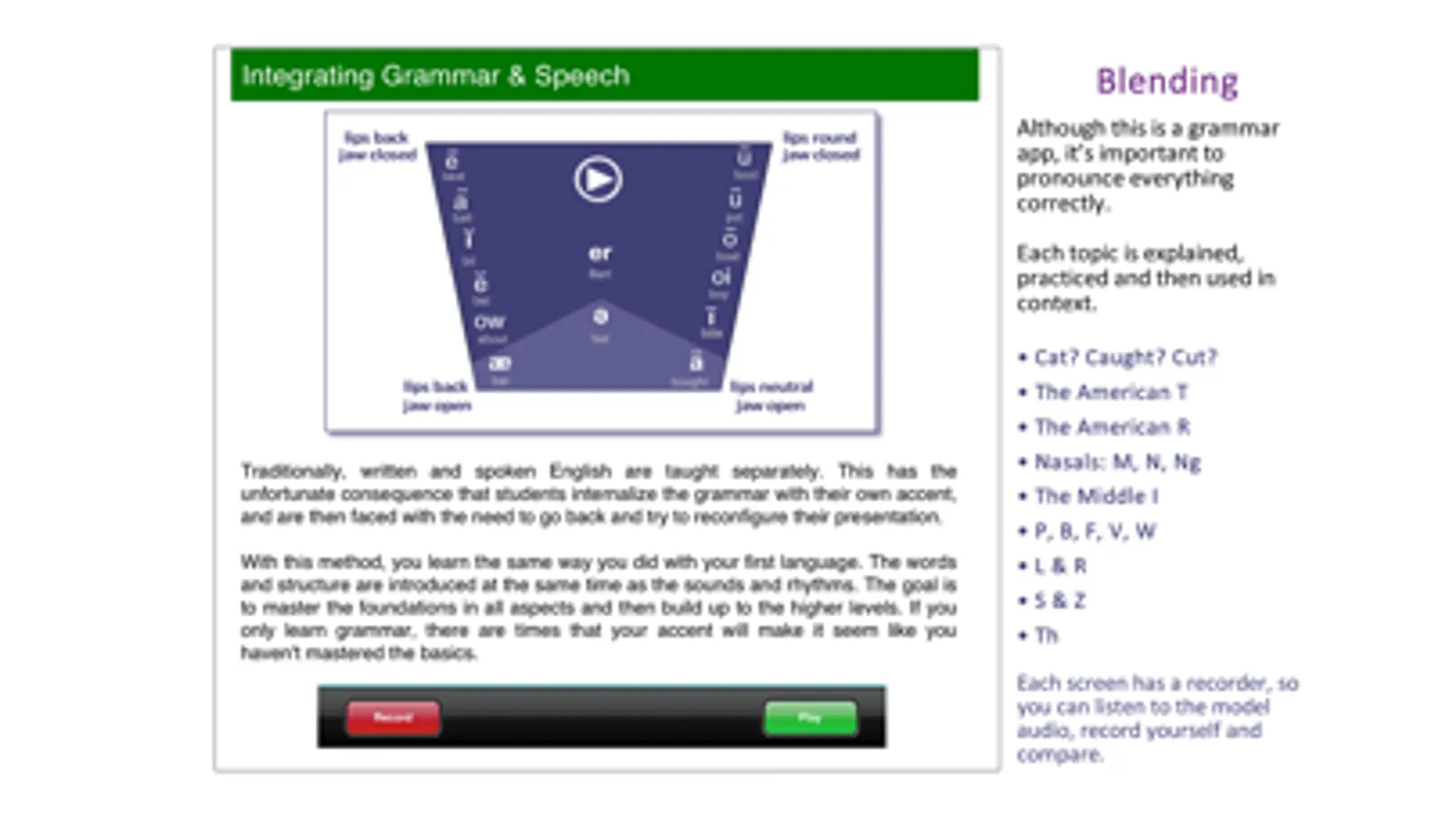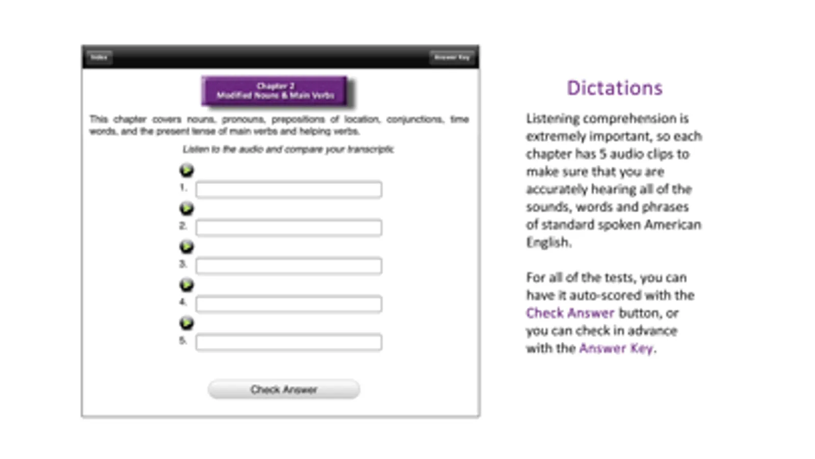 A comprehensive grammar, accent and pronunciation program designed to teach American English. It includes comprehensive placement testing, 10 chapters combining grammar and accent, with exercises, quizzes and tests. There are many audio files and a voice recorder (not for iPod Touch) for the user to compare with the model audio. The dictation exercises improve listening comprehension. Each chapter has a submittable essay. An English dictionary has all the words in the program with a simple definition for each. Translation dictionaries are included in Chinese, Hindi, Japanese, Korean, Russian, Spanish and Vietnamese.