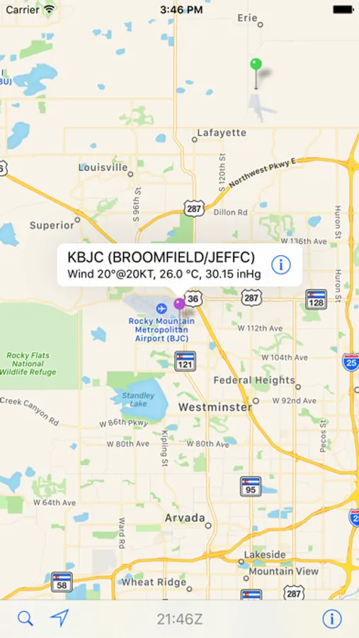 - tap a station to quickly show the current weather, tap again to display detailed information such as present weather and density altitude