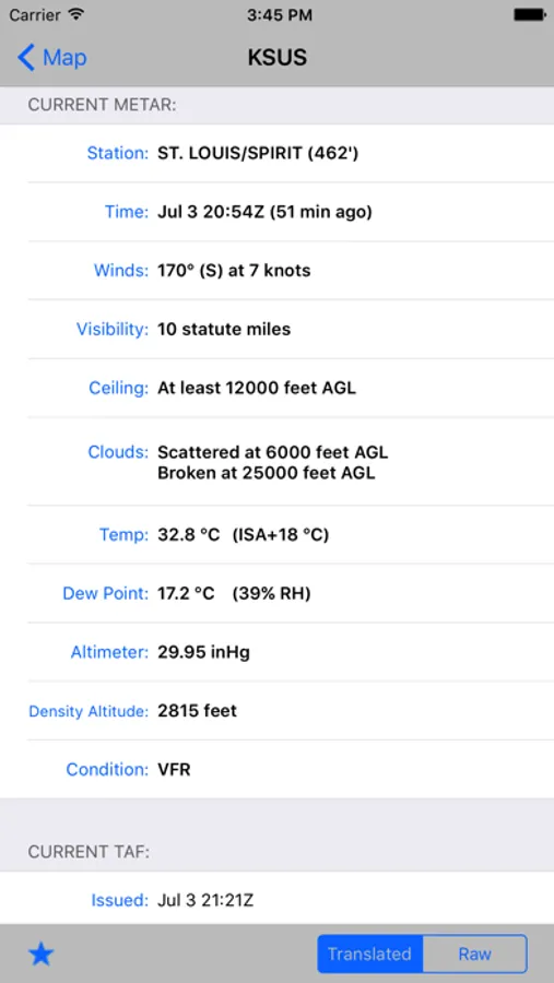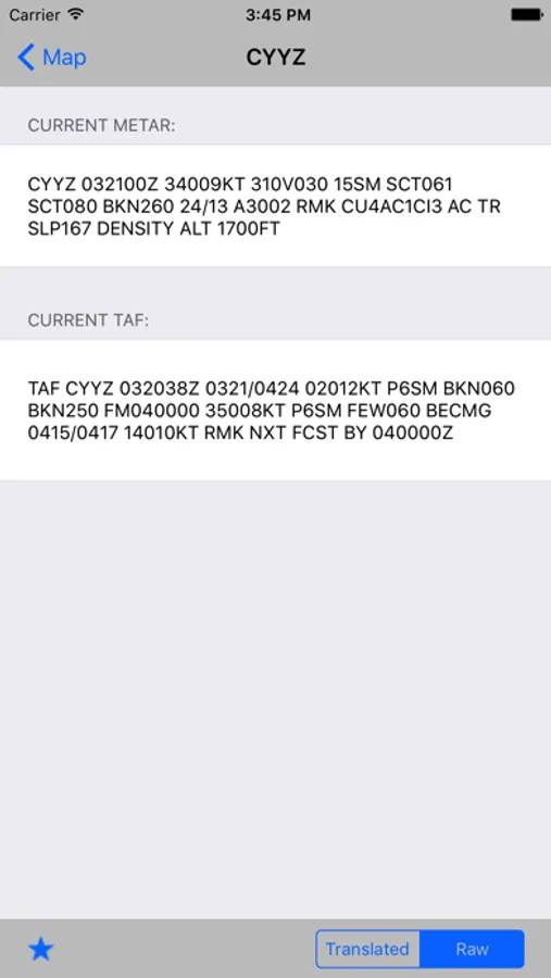 - display METARs (observations) and TAFs (forecasts) in their concise coded format, or view them in a helpful translated presentation
