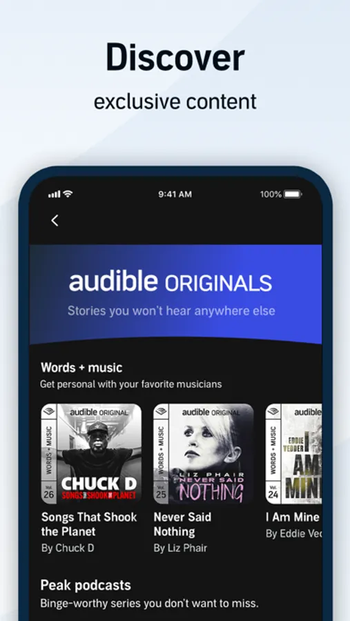 Listen to thousands of originals, audiobooks, and podcasts including exclusive shows and series.