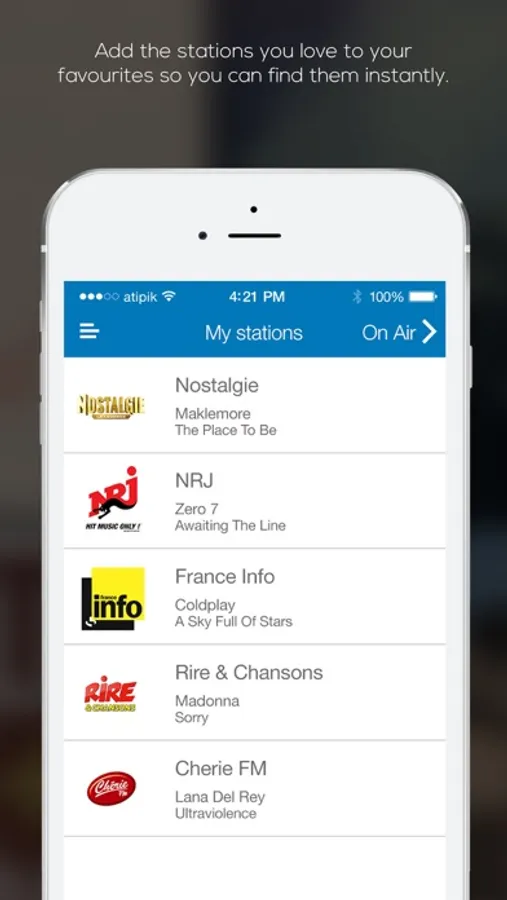 Discover this completely innovative version, a unique way to listen to your favourite stations. No more slow and hard-to-use applications with thousands of stations you'll never listen to. FrenchRadio allows you to listen to your stations instantaneously and browse songs being played in real time or stations' playlists.