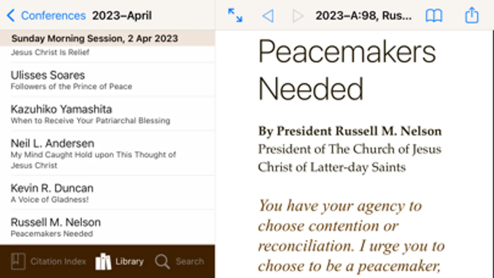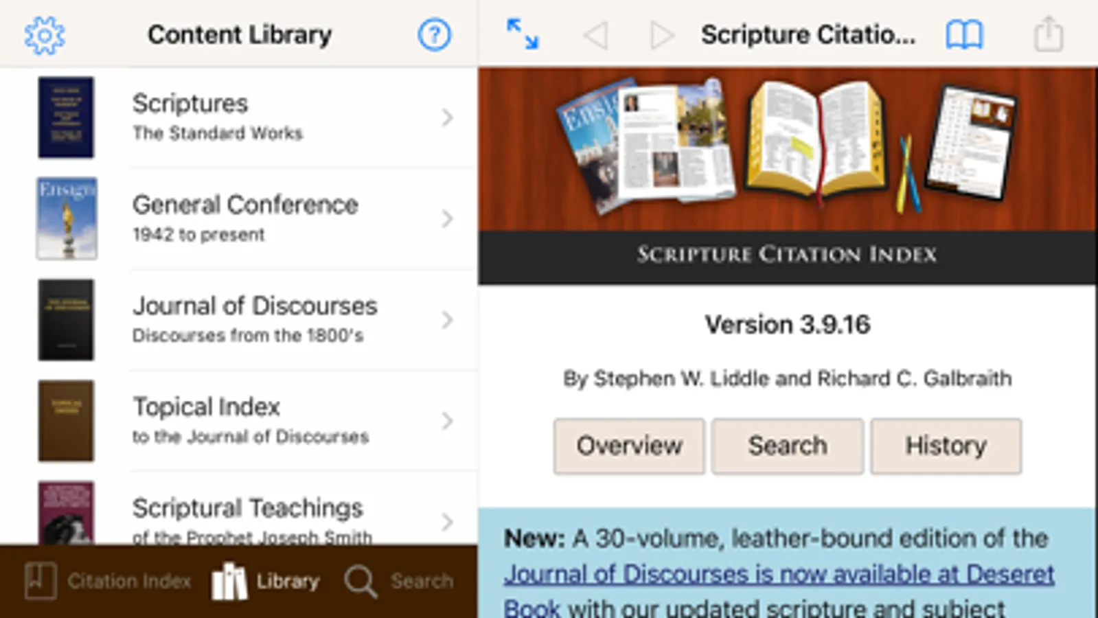 This app lets you navigate easily between the scriptures (standard works of The Church of Jesus Christ of Latter-day Saints: The Holy Bible, The Book of Mormon, etc.) and the General Conference talks and other writings that cite those scriptures.