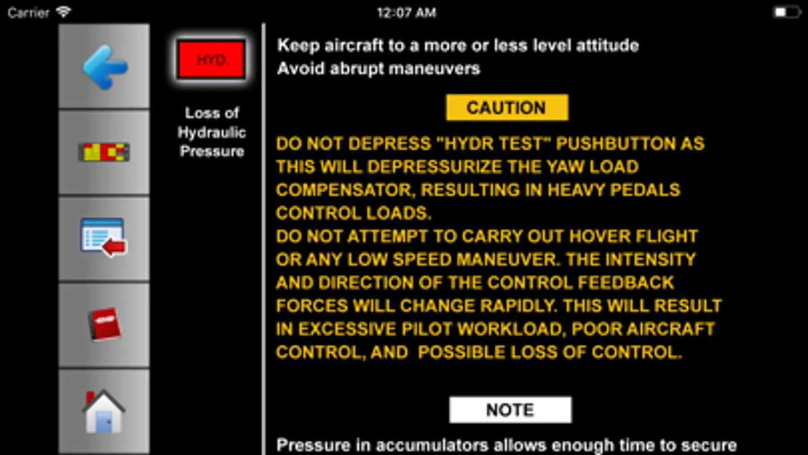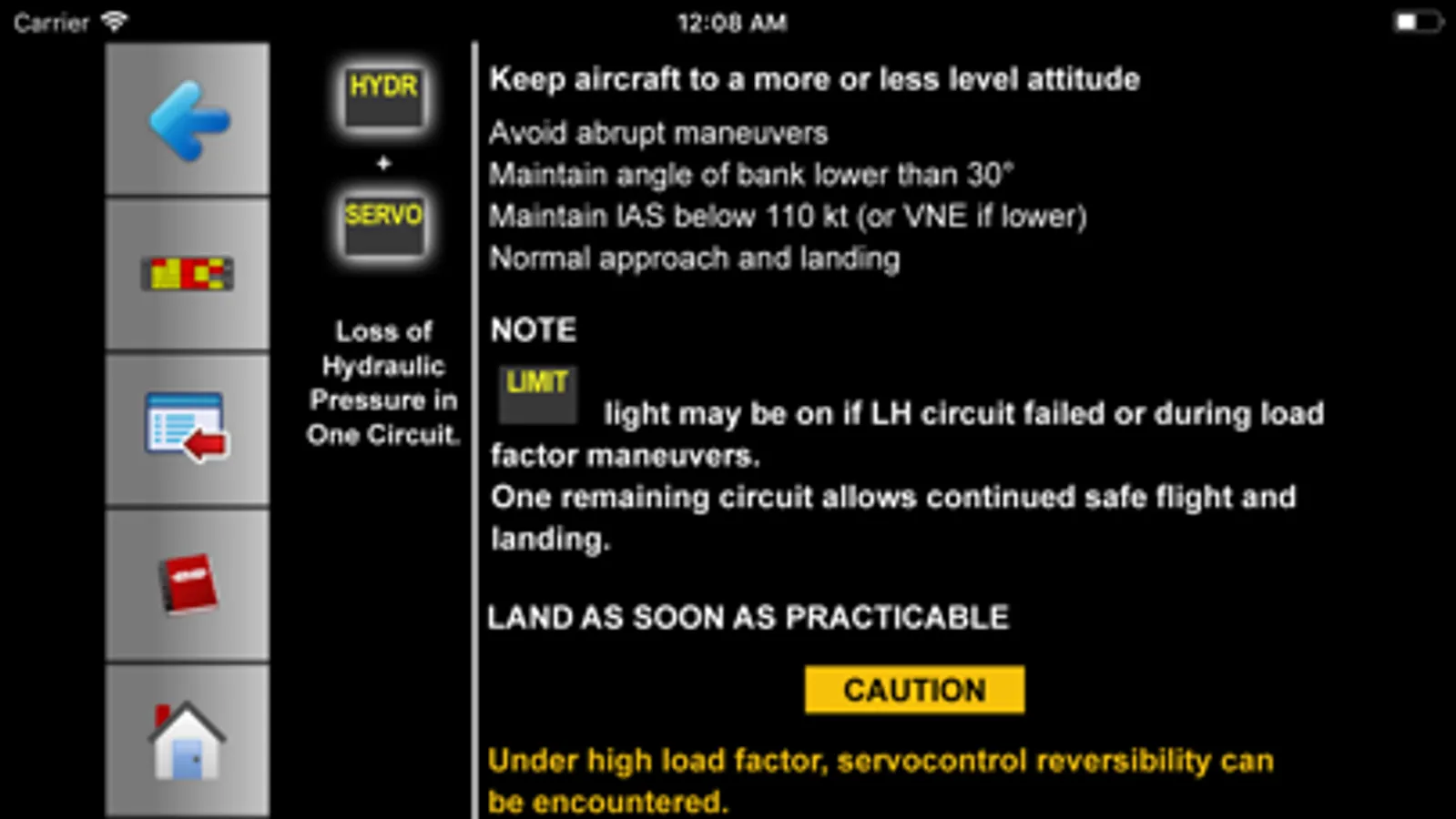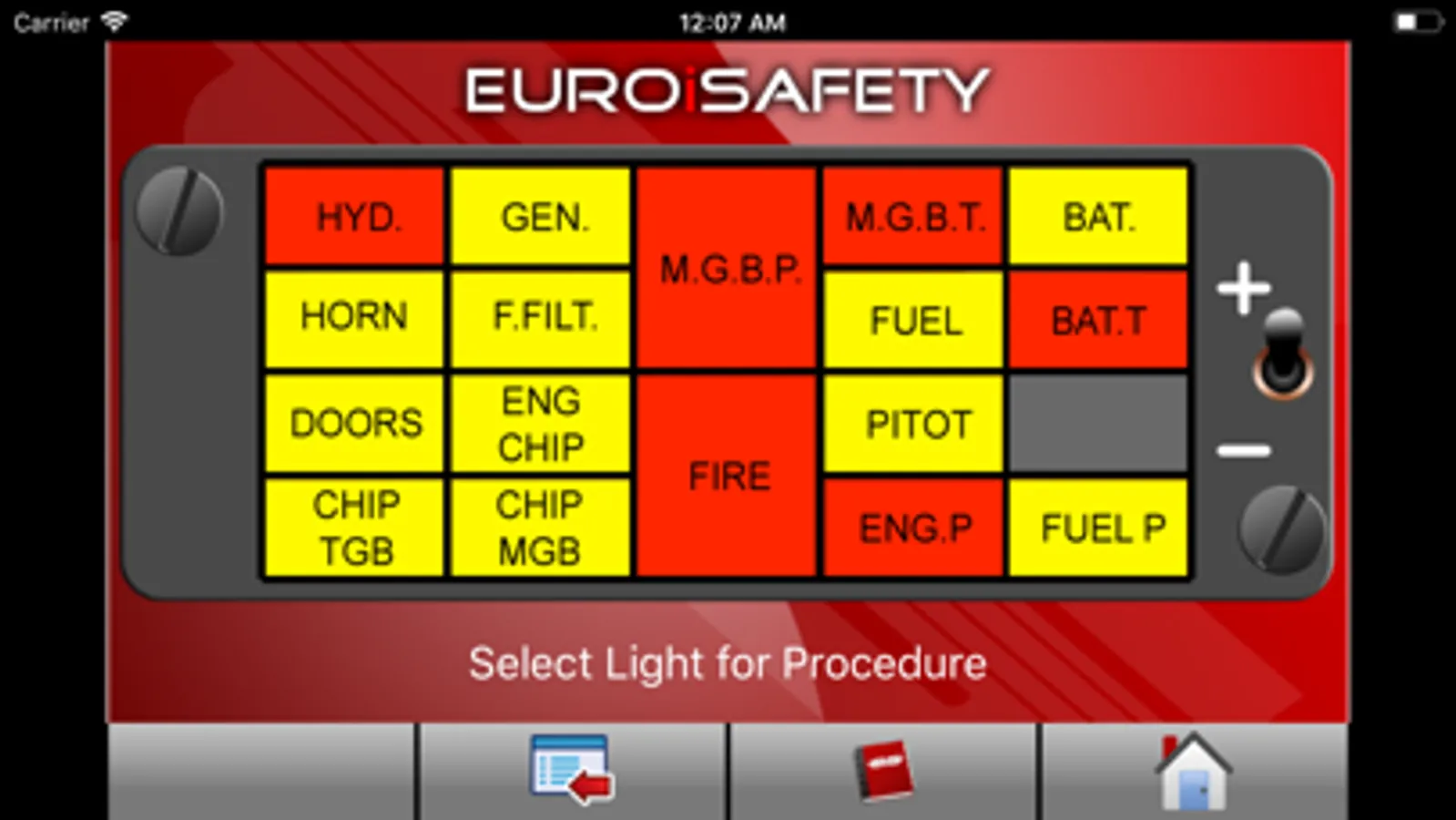 This training tool has three different modes. The user can start with the caution panel without any lights illuminated, with all the light illuminated and the training mode which illuminates a random light. After which the emergency procedure can be selected and reviewed.