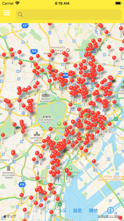 地図には赤いピンで立ち食いそば屋の場所が表示されます。