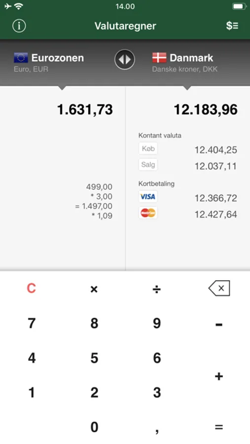 Når du bruger valutaberegneren, får du vist flere resultater/kurser. Der er fordi kurserne og dermed prisen er forskellig alt efter, hvordan du betaler. Er det fx et køb over nettet, du vil betale med dit kort? Eller vil du købe eller sælge rejsevaluta?