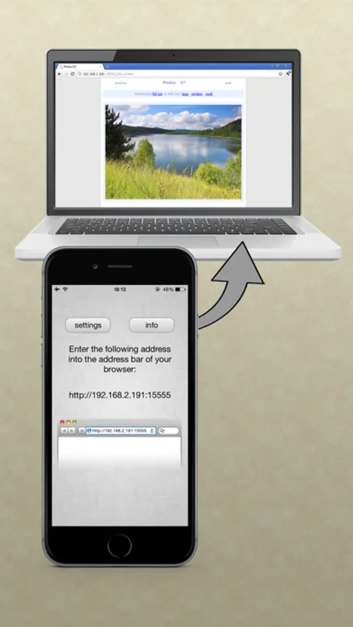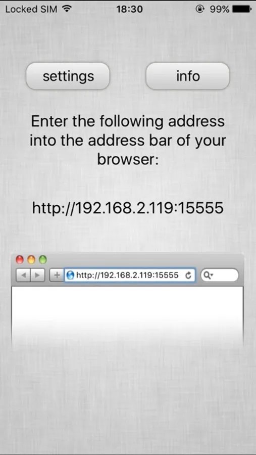 Just start the app and enter the displayed address into the address bar of your browser. Works with any computer that has a modern browser (like desktop or portable computers, iPads, or even an other iPhone) and is on the same wifi network as your phone, iPod or iPad.