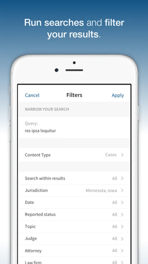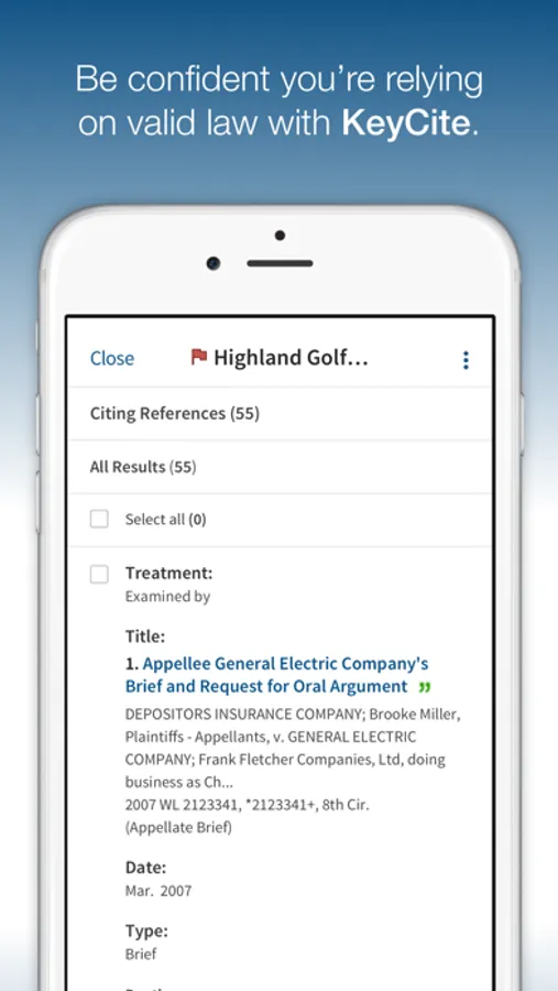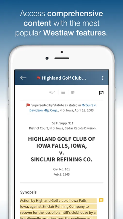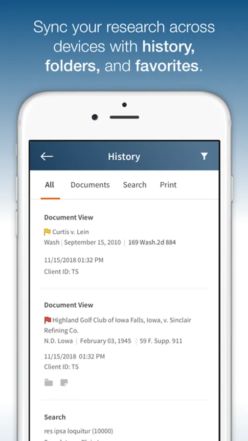 Access the same research features you rely on such as WestSearch, KeyCite, Search Filters, Folders, History, Notes, and Highlighting, which have all been redesigned for the iPad and iPhone. In addition to core research functionality, the Westlaw app offers the ability to save documents while online and offline to research folders, and deliver documents via email, print, or download.