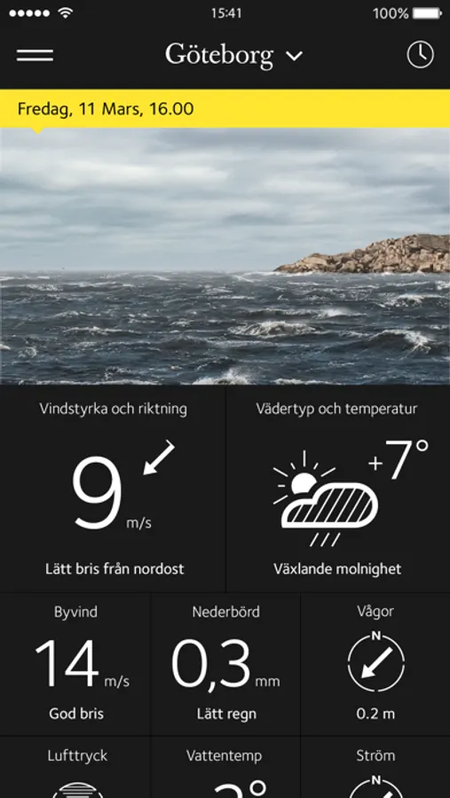 I appen kan du även ta del av den senaste sjörapporten från SMHI. Kustväder visar klass 1-, 2- och 3-varningar för vind, åska samt stora regnmängder för den position du söker prognos för.