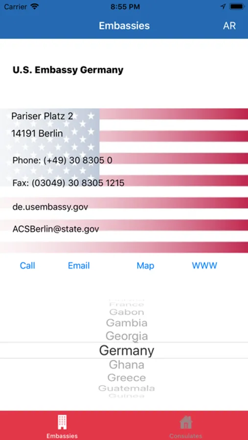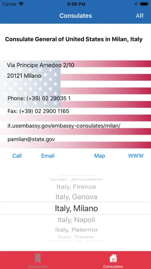 Wherever you are, you have access at any time and without the necessity of a data connection to your U.S. embassy or consulates: