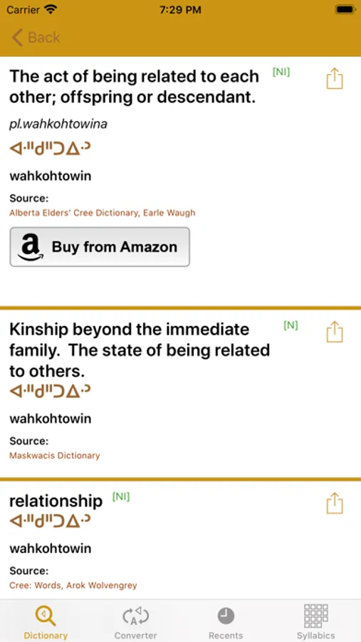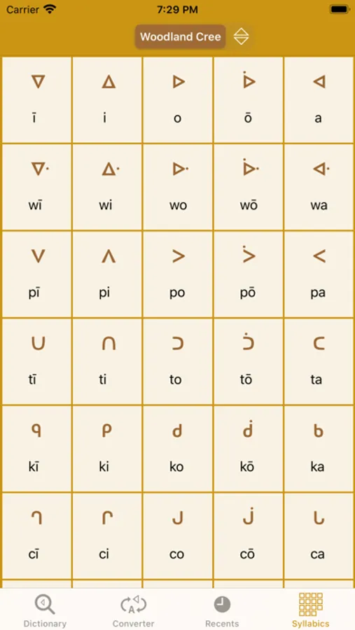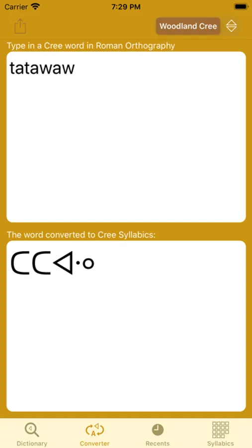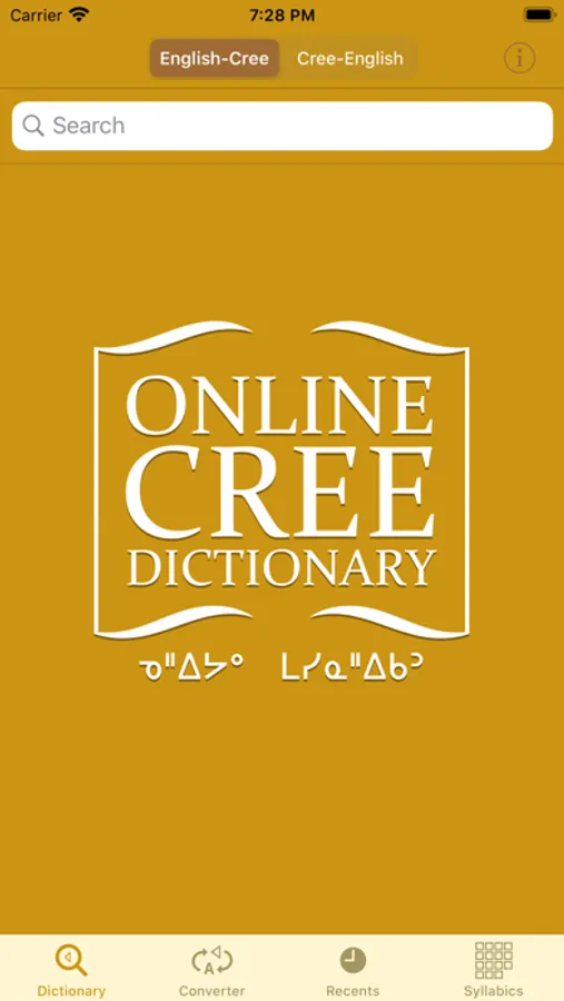 Cree Dictionary is a first dictionary app for Canada Cree language. It is designed for the iPhone and iPad to use the Online Cree Dictionary to retrieve words and perform Roman to Cree Syllabics conversion.