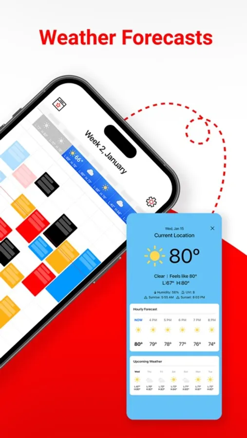 See upcoming Weather Forecasts on your calendar, right where you need them. Unlike other weather services, Weather Forecasts for WeekCal is built right into your calendar to give you accurate & convenient weather information.