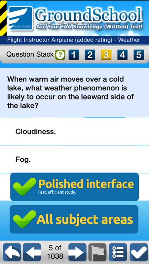 Don't be fooled by imitators! Competing apps use only the limited set of questions that the FAA publicly releases via its website - that is not enough to adequately prepare you for your test! Our GroundSchool app, on the other hand, features a much more comprehensive database (typically about 2-4 times the size of the demo FAA public one) of actual and current FAA questions that you likely can and will be asked on the actual test! This along with our detailed, professional explanations and easy to use interface are major reasons why pilots have come to trust GroundSchool.