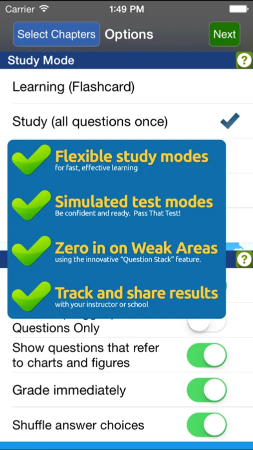 * Several flexible study modes - fits the way you want to study!