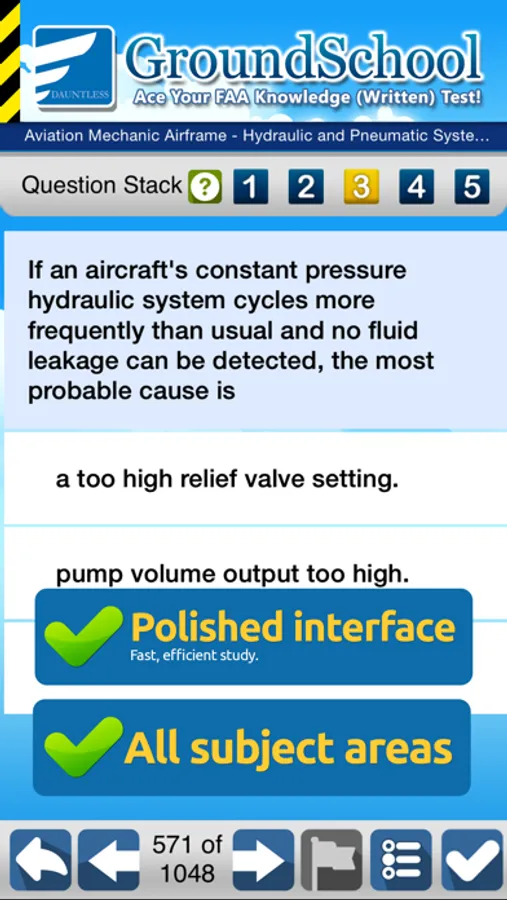 Don't be fooled by imitators! Competing apps use only the limited set of questions that the FAA publicly releases via its website - that is not enough to adequately prepare you for your test! Our GroundSchool app, on the other hand, features a much more comprehensive database (typically about 2-4 times the size of the demo FAA public one) of actual and current FAA questions that you likely can and will be asked on the actual test! This along with our detailed, professional explanations and easy to use interface are major reasons why pilots have come to trust GroundSchool.