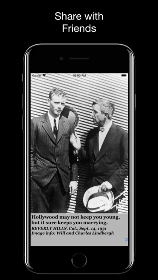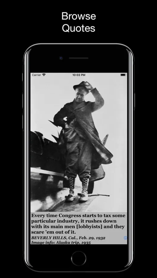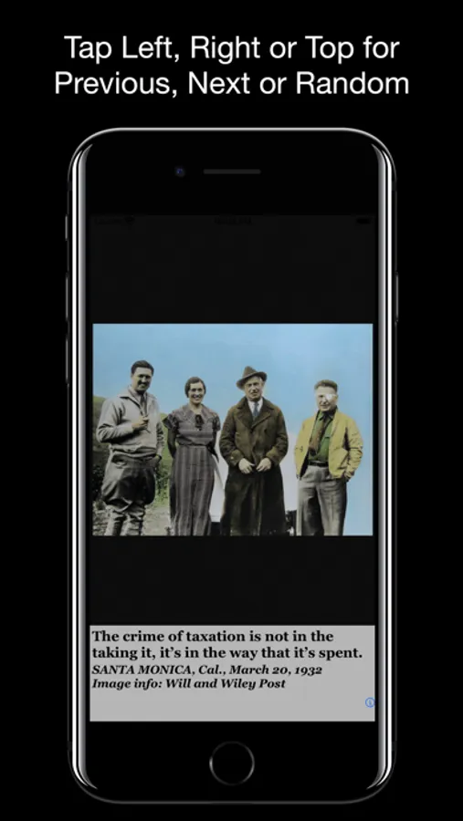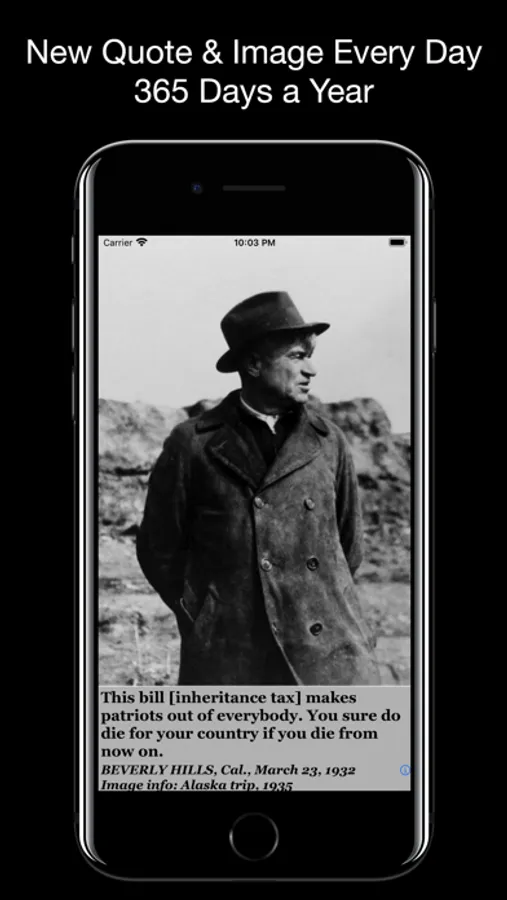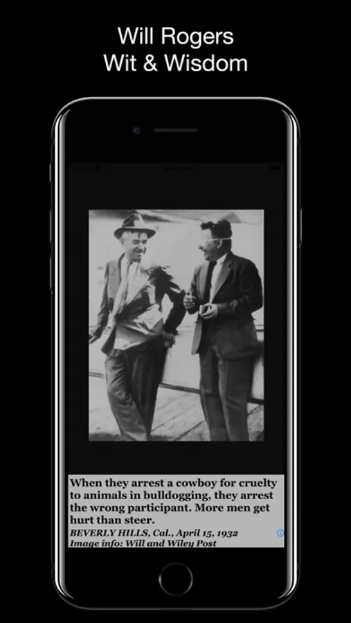 Easy to use! The simplicity of Will Rogers Daily Quotes allows you to focus on these inspiring quotes without distraction. The day's quote is displayed upon launch. Scroll up for longer quotes. For browsing the collection of 365 images and quotes, touch mid-right to advance one day. Touch mid-left to go back one day. Touch top of image for random quote. Touch "i" for help and other features such as sharing via Facebook or email.
