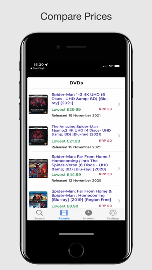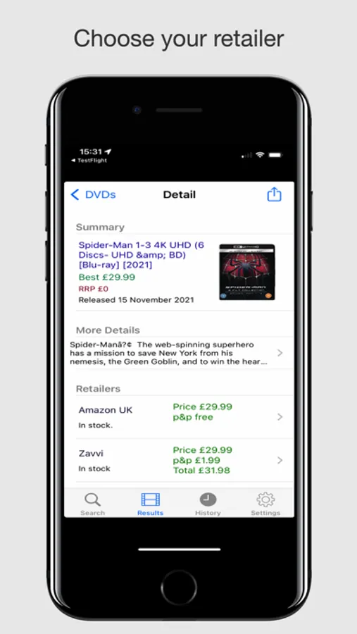 find-DVD will display a list of results that match your search criteria. Just tap on a match and find-DVD will display the list of retailers who are selling the DVD and tell you who is the cheapest.