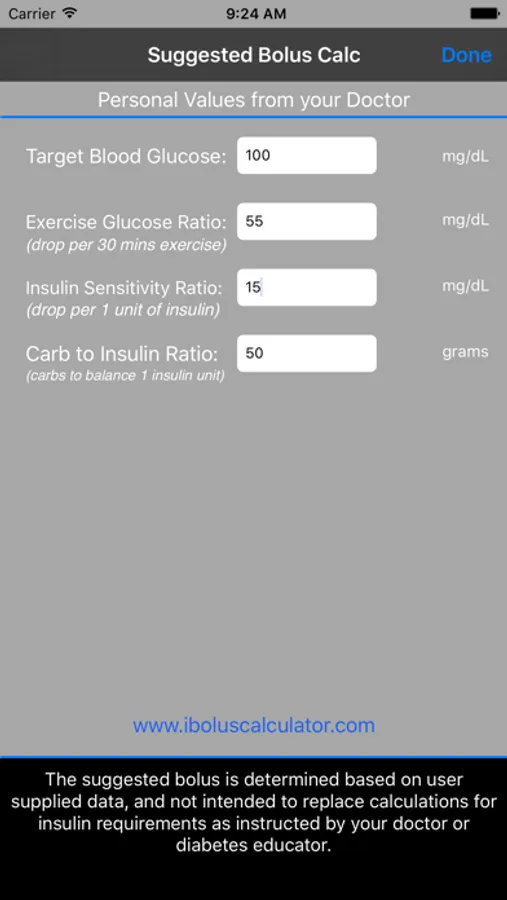 Important: The suggested insulin bolus is based on user supplied data (one time entry that can be changed as diabetic’s ratios change), and not intended to replace calculations for insulin requirements as instructed by your doctor or diabetes educator.