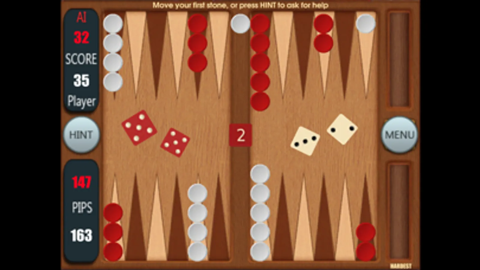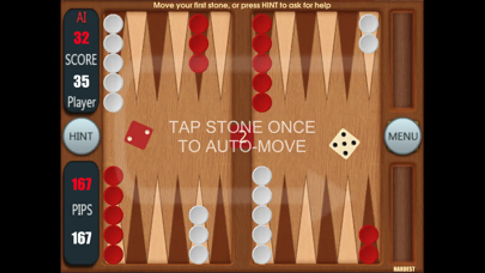 Play against the AI at four levels of difficulty. REPLAY the most recent opponent's move. Get a HINT from AI to help you with your next move, or UNDO your most recent move. ROLL your dice with a shake, or with a single tap. AUTO COMPLETE a move with a single tap on your stone.
