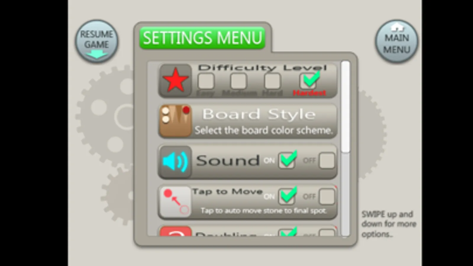 Use the SETTINGS menu to select board style, enable or disable sounds, control speed of the stone animations, and more. Use the HELP screens to learn about the game.