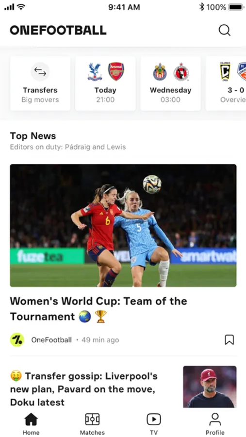 - OneFootball Newsroom: a team of journalists and editors specialised in soccer working 24 hours a day because soccer never rests