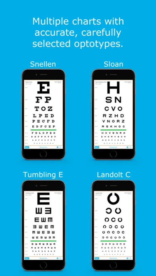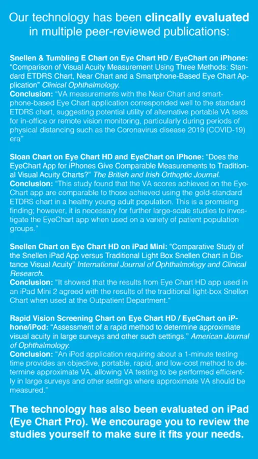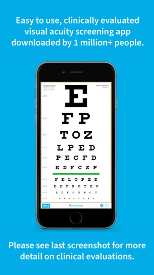 Easy to use, clinically evaluated visual acuity screening app. Over 1M people have downloaded our mobile electronic eye charts for iOS. Read below for more information on the clinical evaluations.