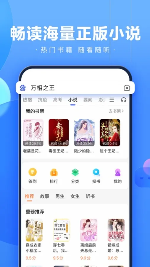 海量正版小说随心看,新增书架列表、阅读进度可以多台设备自动云同步。