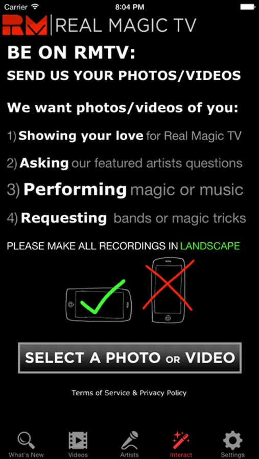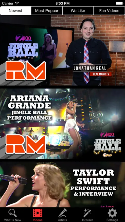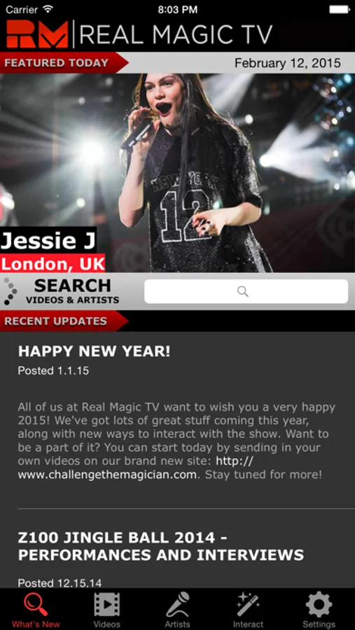Artists profiles, featured videos, tour dates, social media and streaming music. Each week Real Magic TV features a new artist on the app. Users can learn about the artists, listen to full songs, watch interviews, magic and live performance videos, and share the profiles via email, messaging and social media.