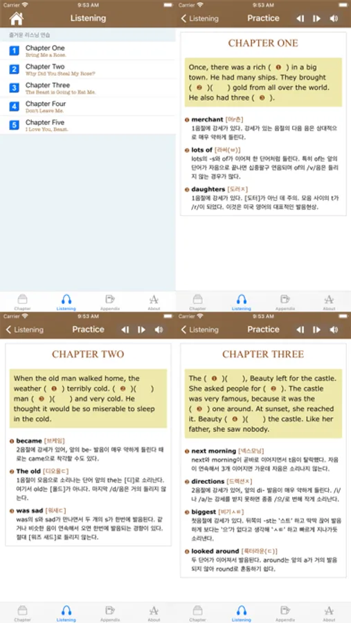 1. 각 page 내용마다 원어민 음성을 들으면서 독해 학습을 할 수 있습니다.