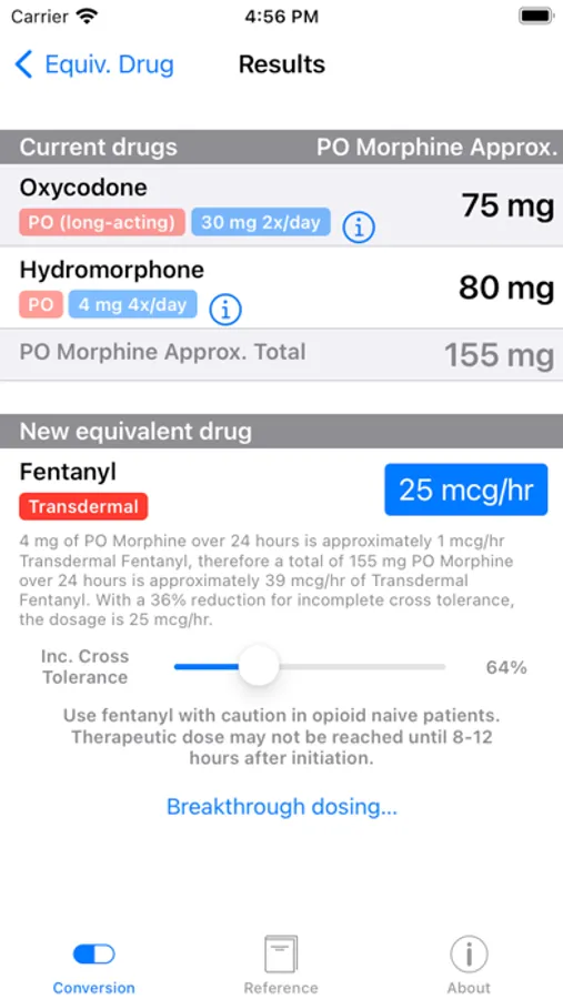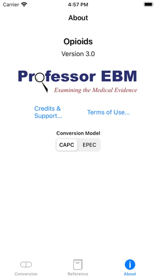 Opioid equipotency data is taken from CAPC conversion values except where noted (see the reference tab in the app.) CAPC values are as published in the Center to Advance Palliative Care Prescribing Opioids: A Reference Guide curriculum, which are adapted from McPherson ML. Demystifying Opioid Conversion Calculations: A Guide for Effective Dosing, 2nd ed. American Society of Health-System Pharmacists, Bethesda, Maryland, 2018. EPEC values are as published in EPEC-O Participants Handbook, 2005.