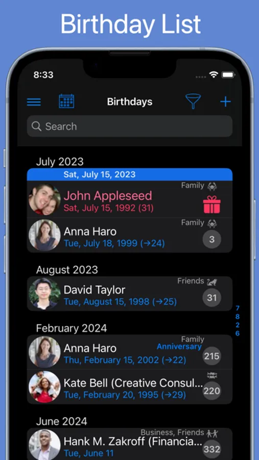 Take charge of birthdays, anniversaries, and more, and never miss a special event again! Try the ultimate birthday app designed to keep you at the forefront of every upcoming celebration. Download our intuitive birthday tracker and contact reminder app today to kickstart the thrilling birthday countdowns for all the important people in your life!