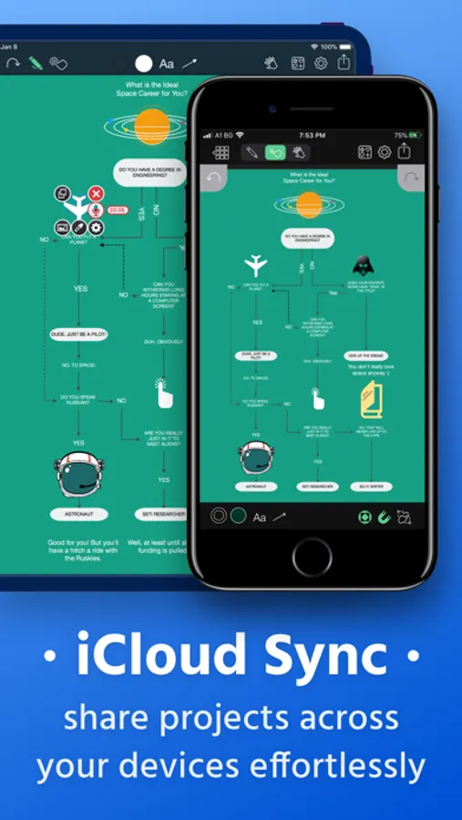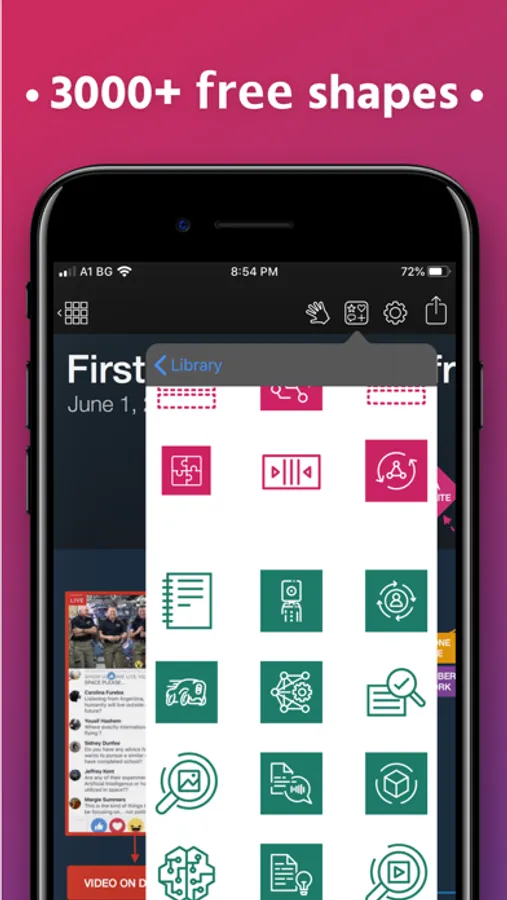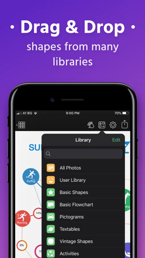 Some diagrams require more advanced objects. Grafio provides thousands of shapes that you can easily drag in from the library. In addition, you can embed images from your Camera Roll into shapes and connect them to your other shapes.