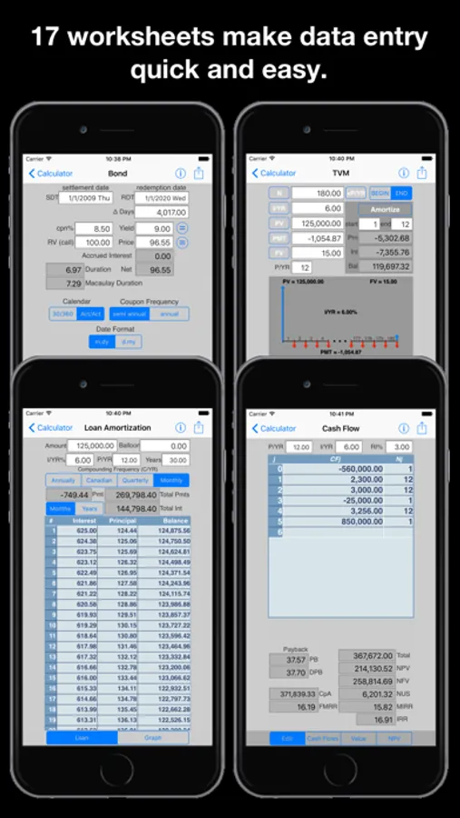 Quote from a customer: "Last week I had a meeting with my accountants and my bankers. We were working on the pro forma balance sheets and cash flows for a new project I'm working on. They were all asking why I had switched to the iPhone for I used to be a die hard "brandX phone" fan. I said that one could do so much more. They said "yea...sure" (they were all using "brandX phones") until I started using your calculator. We were analyzing different payment and amortization schedules. They were so impressed by how easily we could figure out the amount of interest, principal and remaining loan balance for any certain period or combination of periods that in the end they were saying "I have to get me one of those". Great product. Thanks."