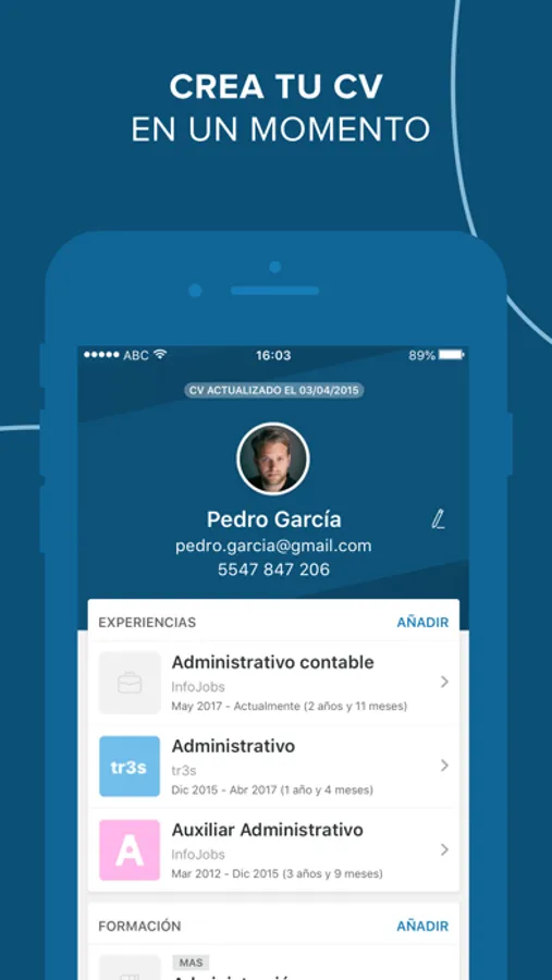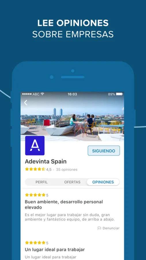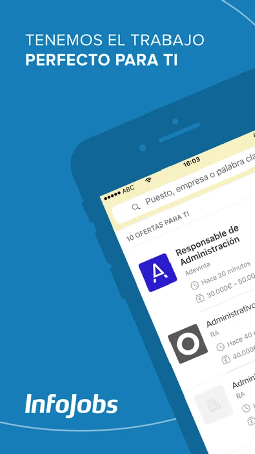 Nosotros te ayudamos a conseguir el trabajo que quieres. Sí, ese en el que estás pensando. Porque vas a tener la app líder de búsqueda de empleo contigo. Entra y busca ofertas para ti, inscríbete en las que más te gusten y sigue tus candidaturas desde el móvil. Y no olvides actualizar tu CV porque las mejores empresas españolas y extranjeras publican sus ofertas de trabajo y buscan sus candidatos en InfoJobs.