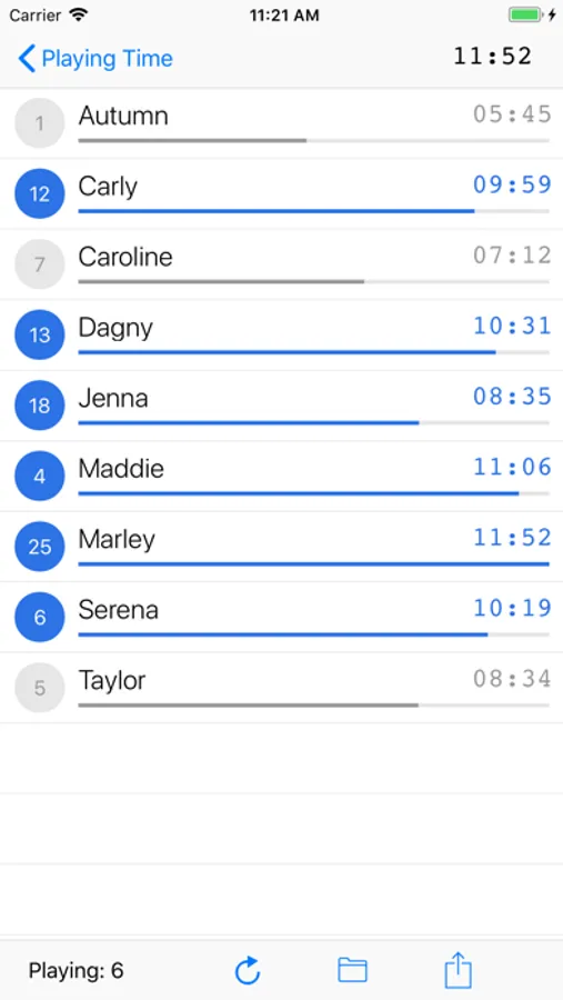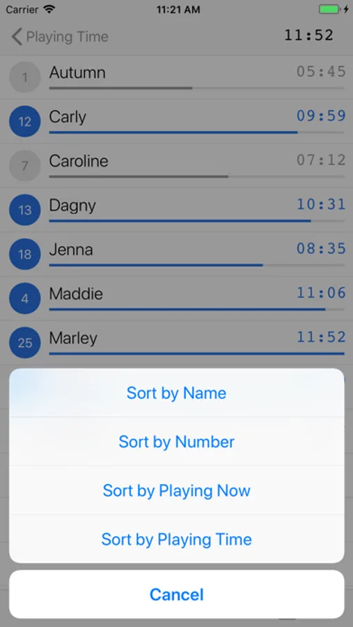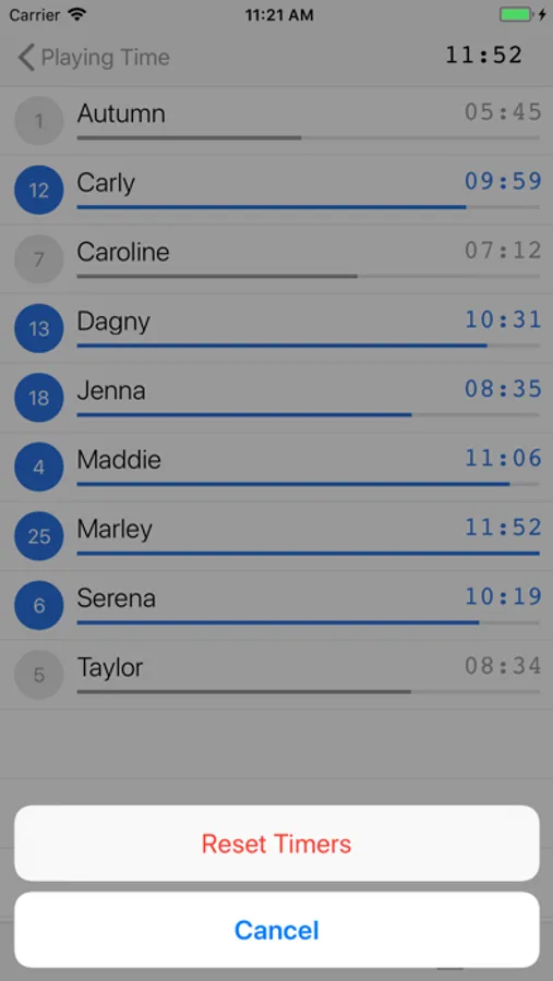 This application will let you track the playing time for each player. You can use it during the game to help manage playing time for those cases when equal playing time is the goal, or after the game is over to see what actually happened.