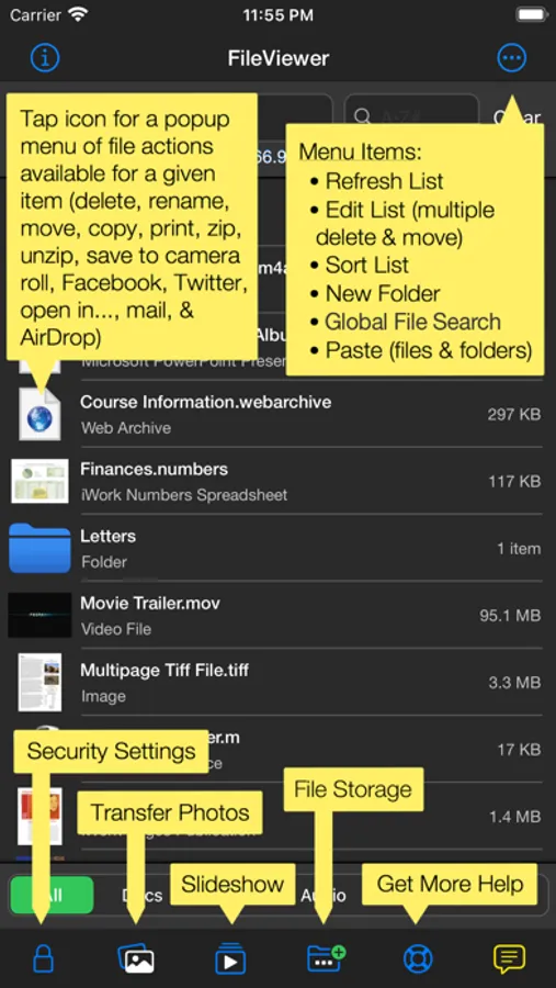 • Files are transferred to FileViewer USB, via iTunes (Finder in Mac OS 10.15 Catalina), using a Wi-Fi or USB connection, or via email, AirDrop, the Files app, or connected devices such as thumb drives.